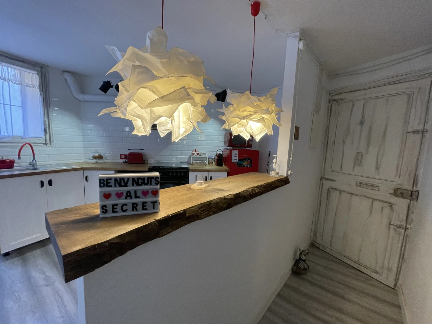 Ubicat al hall de l’edifici, aquest apartament és un espai original i romàntic, un ambiente obert que integra cuina, menjador i sala d’estar.