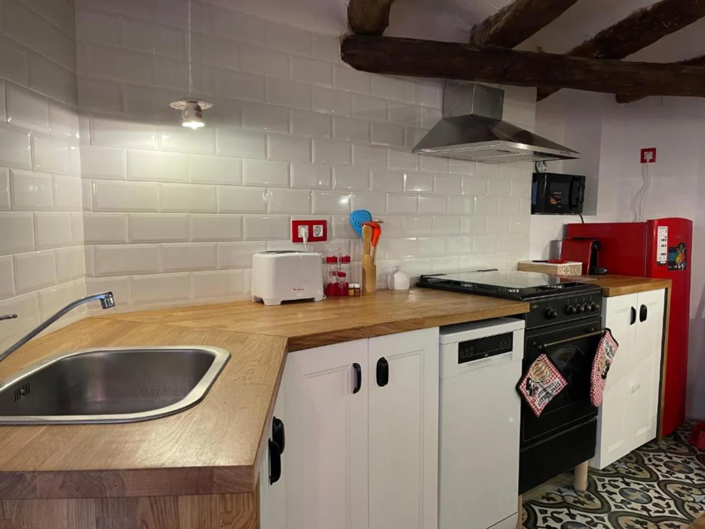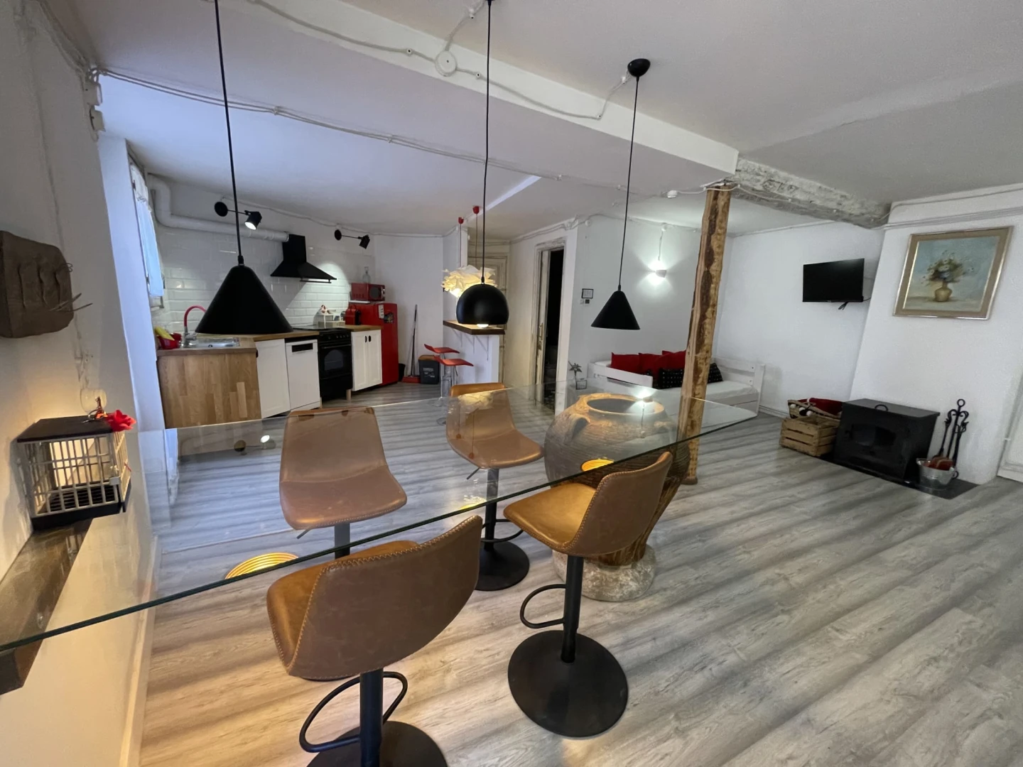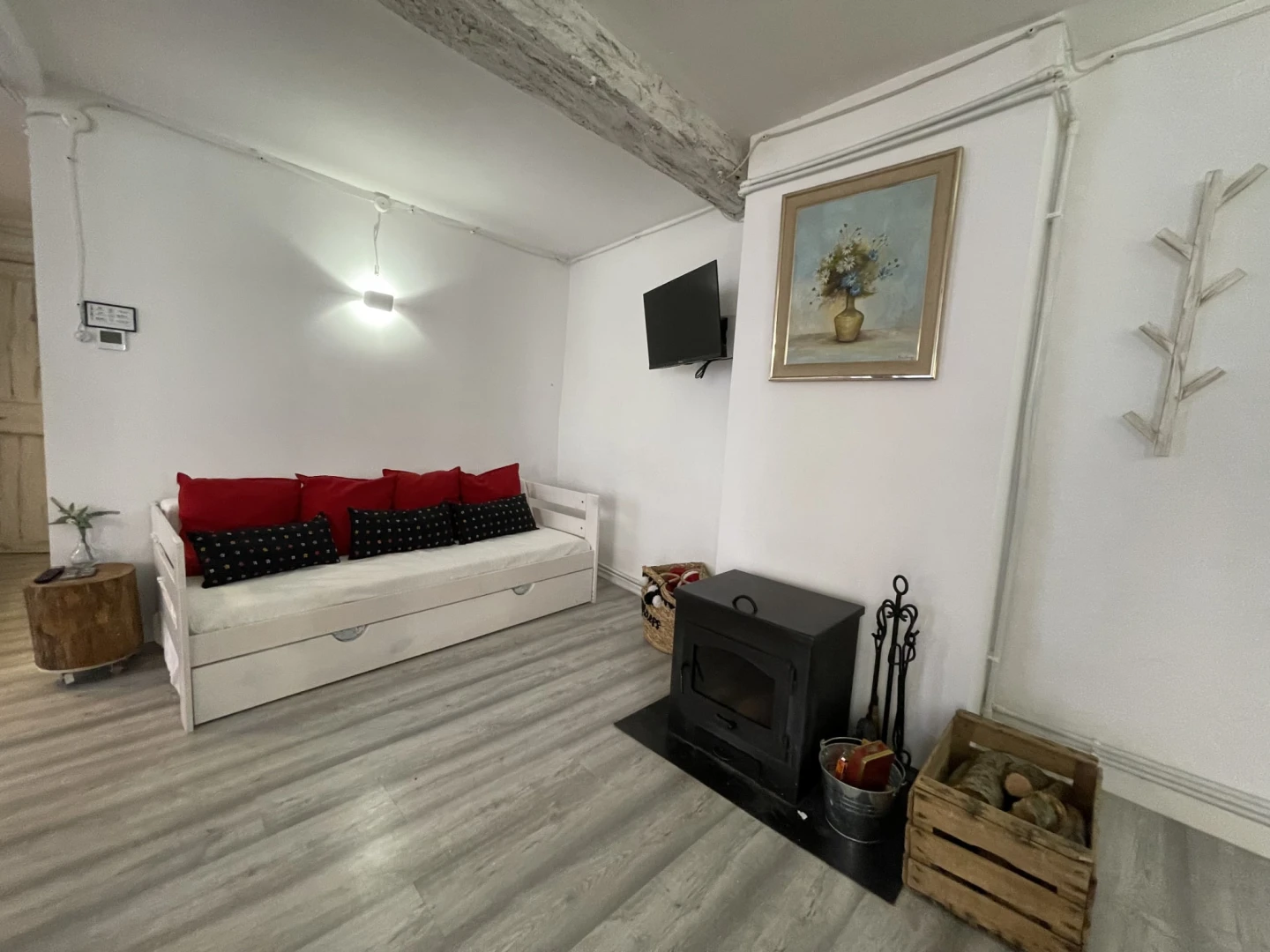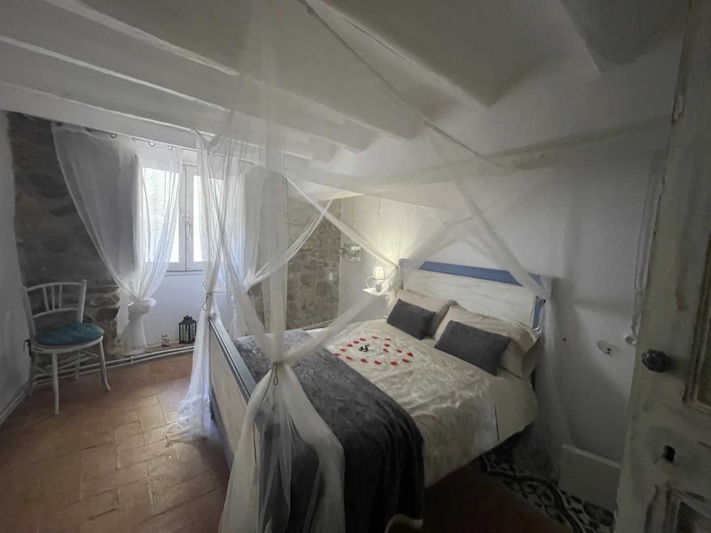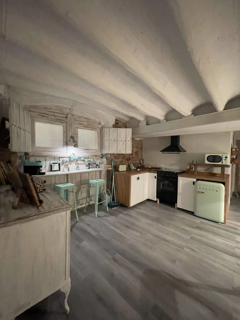 Al segon pis d’un edifici històric amb més de 200 anys, aquest allotjament amb encant combina maó artesanal, bigues de fusta i pedra vista, creant un ambient únic i acollidor.