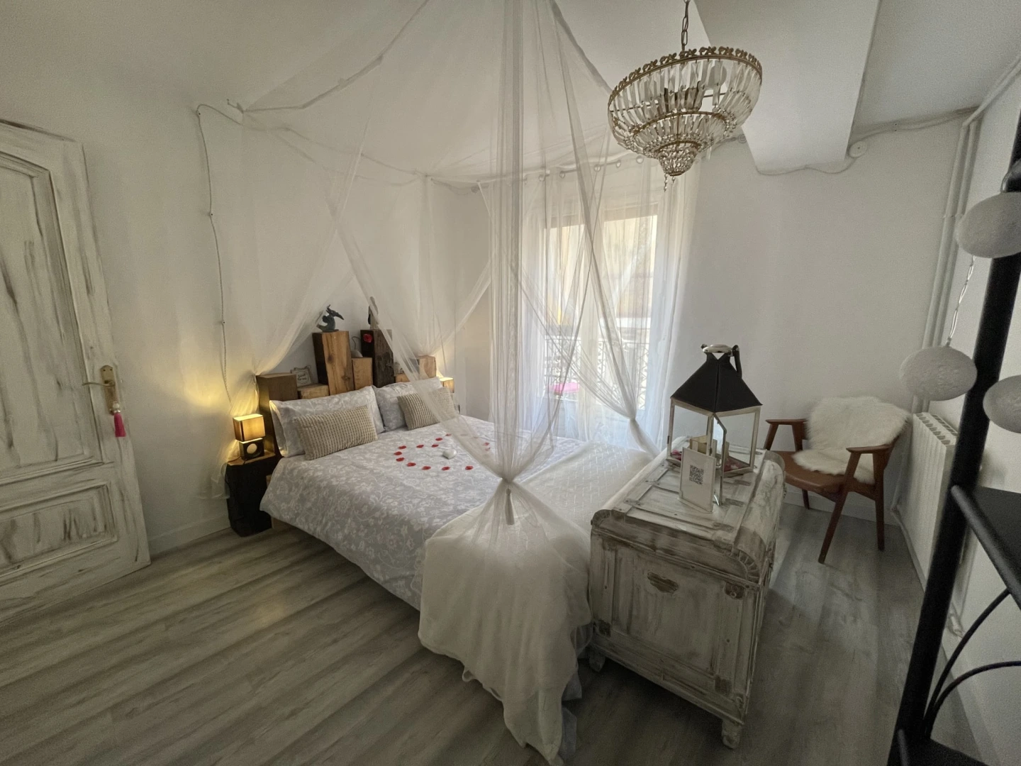 Dispone de 2 dormitorios con camas dobles con dosel, un elegante baño con bañera de hidromasaje doble con luz y música, y un salón-cocina-comedor diáfano con sofá cama para dos plazas adicionales (perfecto para niños). La cocina está totalmente equipada y te recibirá un kit de bienvenida con café, té e infusiones.